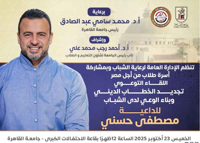 تحت رعاية الأستاذ الدكتور محمد سامي عبد الصادق، رئيس جامعة القاهرة، وإشراف الأستاذ الدكتور أحمد رجب محمد علي، نائب رئيس الجامعة لشؤون التعليم والطلاب، تنظم الإدارة العامة لرعاية الشباب وبمشاركة أسرة طلاب من أجل مصر اللقاء التوعوي بعنوان "تجديد الخطاب الديني وبناء الوعي لدى الشباب"، وذلك يوم الخميس 23 أكتوبر 2025 في تمام الساعة 12 ظهرًا بقاعة الاحتفالات الكبرى بجامعة القاهرة.
