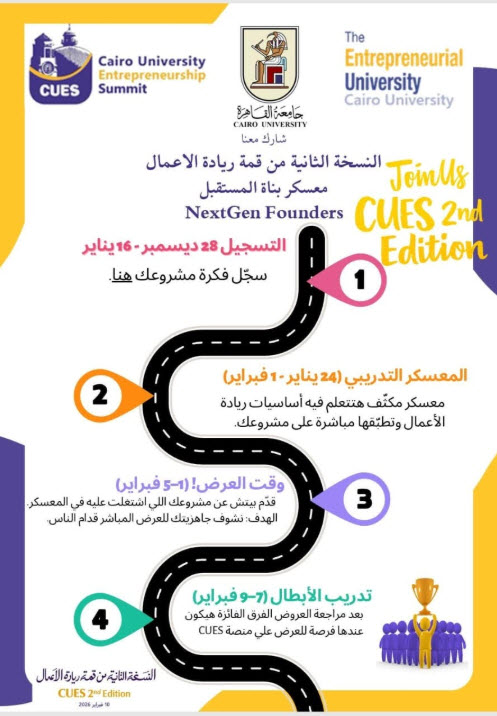 ويمثل المعسكر تجربة تدريبية مكثفة تجمع بين التعلم التطبيقي والتوجيه العملي، حيث يعمل المشاركون على تطوير أفكارهم الريادية وبناء نماذج مشروعات قابلة للتنفيذ، وصولًا إلى تقديم عروض احترافية أمام خبراء ومتخصصين، مع إتاحة فرص متميزة للفرق المتفوقة للعرض على منصة قمة ريادة الأعمال في نسختها الثانية CUES يوم ١٠ فبراير ٢٠٢٦وبناء شبكات داعمة لمسيرتهم المستقبلية.