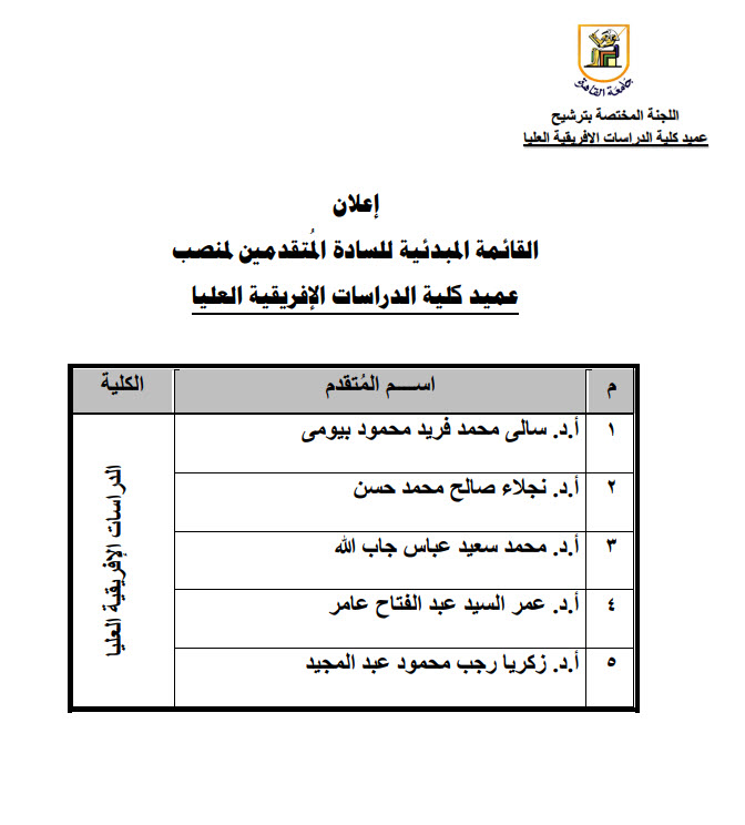 جامعة القاهرة تعلن القائمة المبدئية للمتقدمين لمنصب عميد كلية الدراسات الإفريقية العليا 2026-01-15 عدد الزيارات : 3 أعلنت جامعة القاهرة عن كشف بالأسماء المبدئية للسادة الأساتذة المتقدمين للترشح لمنصب عميد كلية الدراسات الإفريقية العليا وفيما يلي صورة ضوئية من الكشف المعلن