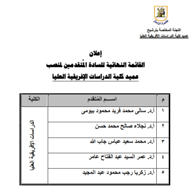 جامعة القاهرة تعلن القائمة النهائية بأسماء السادة المتقدمين لمنصب عميد كلية الدراسات العليا الإفريقية 2026-01-22 عدد الزيارات : 8 أعلنت جامعة القاهرة القائمة النهائية بأسماء السادة المتقدمين لمنصب عميد كلية الدراسات العليا الإفريقية وفيما يلي صورة ضوئية من كشف الأسماء المعلنة