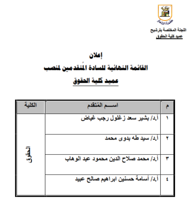 جامعة القاهرة تعلن القائمة النهائية بأسماء السادة المتقدمين لمنصب عميد كلية الحقوق 2026-03-02 عدد الزيارات : 4 أعلنت جامعة القاهرة القائمة النهائية بأسماء السادة المتقدمين لمنصب عميد كلية الحقوق وفيما يلي صورة ضوئية من كشف الأسماء المعلنة