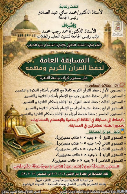 تحت رعاية الأستاذ الدكتور محمد سامي عبد الصادق رئيس جامعة القاهرة، وإشراف الأستاذ الدكتور أحمد رجب محمد نائب رئيس الجامعة لشؤون التعليم والطلاب، أعلنت إدارة النشاط العلمي بالإدارة العامة لرعاية الشباب عن تنظيم المسابقة العامة لحفظ القرآن الكريم وفهمه على مستوى كليات جامعة القاهرة.
