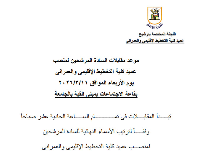 جامعة القاهرة تعلن عن جدول المقابلات للسادة المتقدمين لمنصب عميد كلية التخطيط الإقليمى والعمرانى 2026-03-04 عدد الزيارات : 7 أعلنت جامعة القاهرة عن جدول المقابلات للسادة المتقدمين لمنصب عميد كلية التخطيط الإقليمى والعمرانى وفيما يلي صورة ضوئية من الجدول المعلن