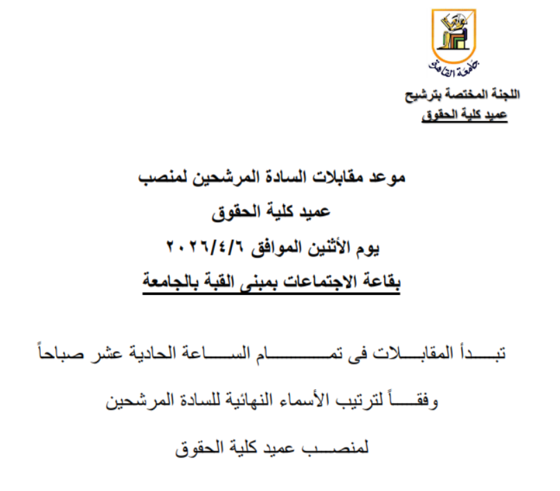 جامعة القاهرة تعلن عن موعد مقابلات السادة المرشحين لمنصب عميد كلية الحقوق 2026-03-15 عدد الزيارات : 21 أعلنت جامعة القاهرة عن موعد مقابلات السادة المرشحين لمنصب عميد كلية الحقوق وفيما يلي صورة ضوئية من الاعلان