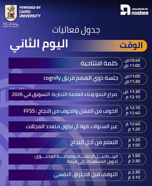 ويعكس برنامج اليوم الثاني تكاملًا واضحًا يجمع بين المهارات التقنية، والوعي النفسي، وتمكين الفئات المختلفة، والانفتاح على الفرص، بما يؤكد حرص جامعة القاهرة على إعداد خريج قادر على المنافسة، ومؤهل لصناعة مستقبله في سوق عمل سريع التغير.